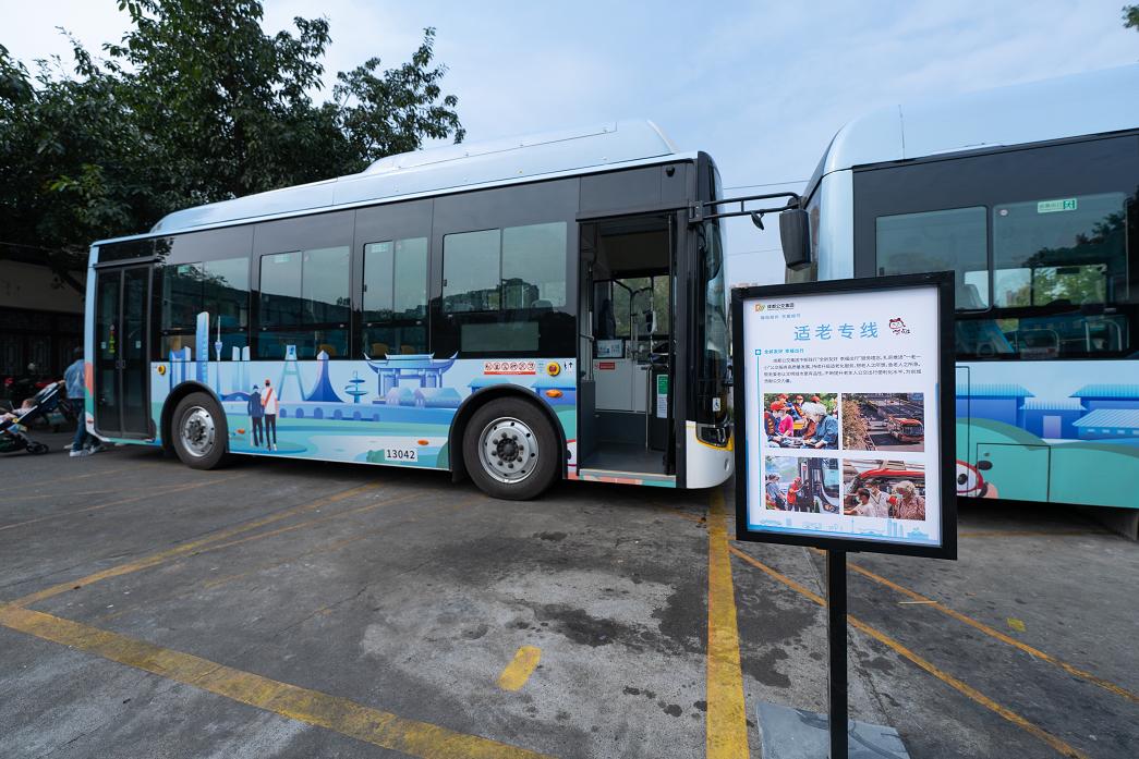 适老巴士配车采用平稳安静的新能源公交车,全系配备塞拉门,直通式低地板配合站台低入口,老年乘客上下车更安全、更贴心。车内搭载的信息屏字体更大,方便老年乘客更加清晰、准确的获取乘车信息。驾驶室后方设置“便民箱”,里面备有放大镜、方便袋、酒精湿巾等各类应急物品,以备不时之需。目前,成都公交已推出了5条“适老巴士”线路。