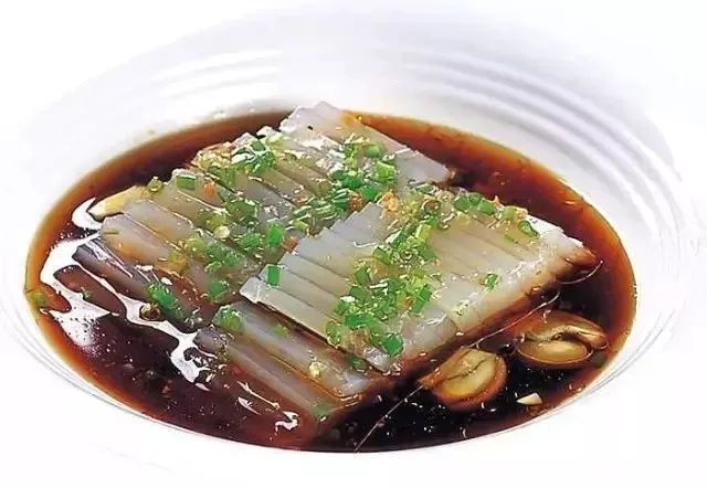3.出菜时,取出鱼冻切成片装盘,浇上醋汤并撒些葱花,即成。