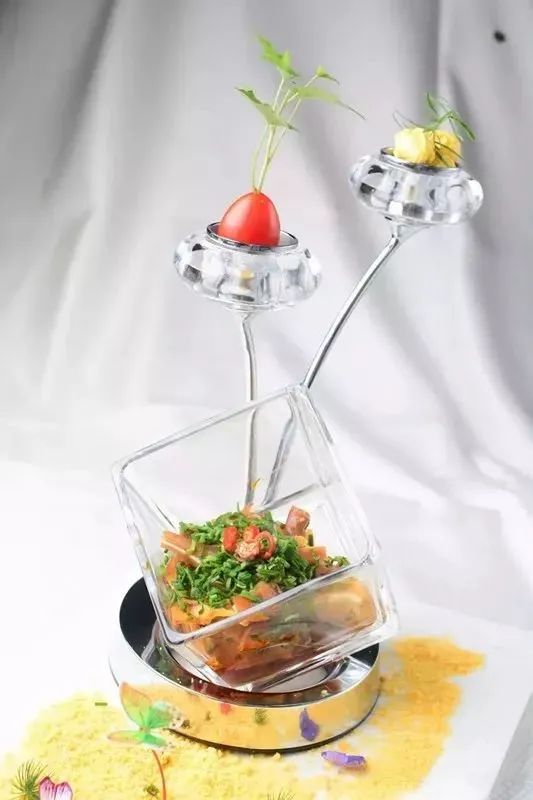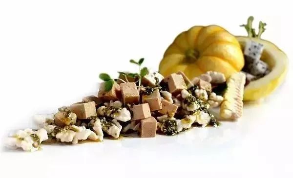 2.出菜时,取出鹅肝切成丁,再与去皮鲜桃仁纳盆,加入椒麻糊拌匀,装盘后点缀香椿苗即成。