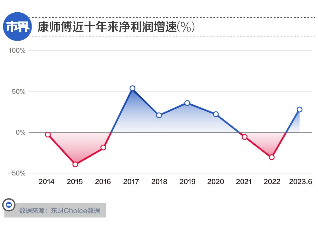 2023年上半年,康师傅的方便面业务营收仅同比增长2.97%,为139.5亿元,但净利润却暴涨48.11%,达到8.06亿元,而同期康师傅饮品业务营收虽然达到266.01亿元,是方便面业务的两倍,但饮品净利润为11.64亿元,净利润率明显不及方便面。与此同时,康师傅的净利润增速也再度回到正增长,这也是2017年出现暴涨50%后的又一重要节点。