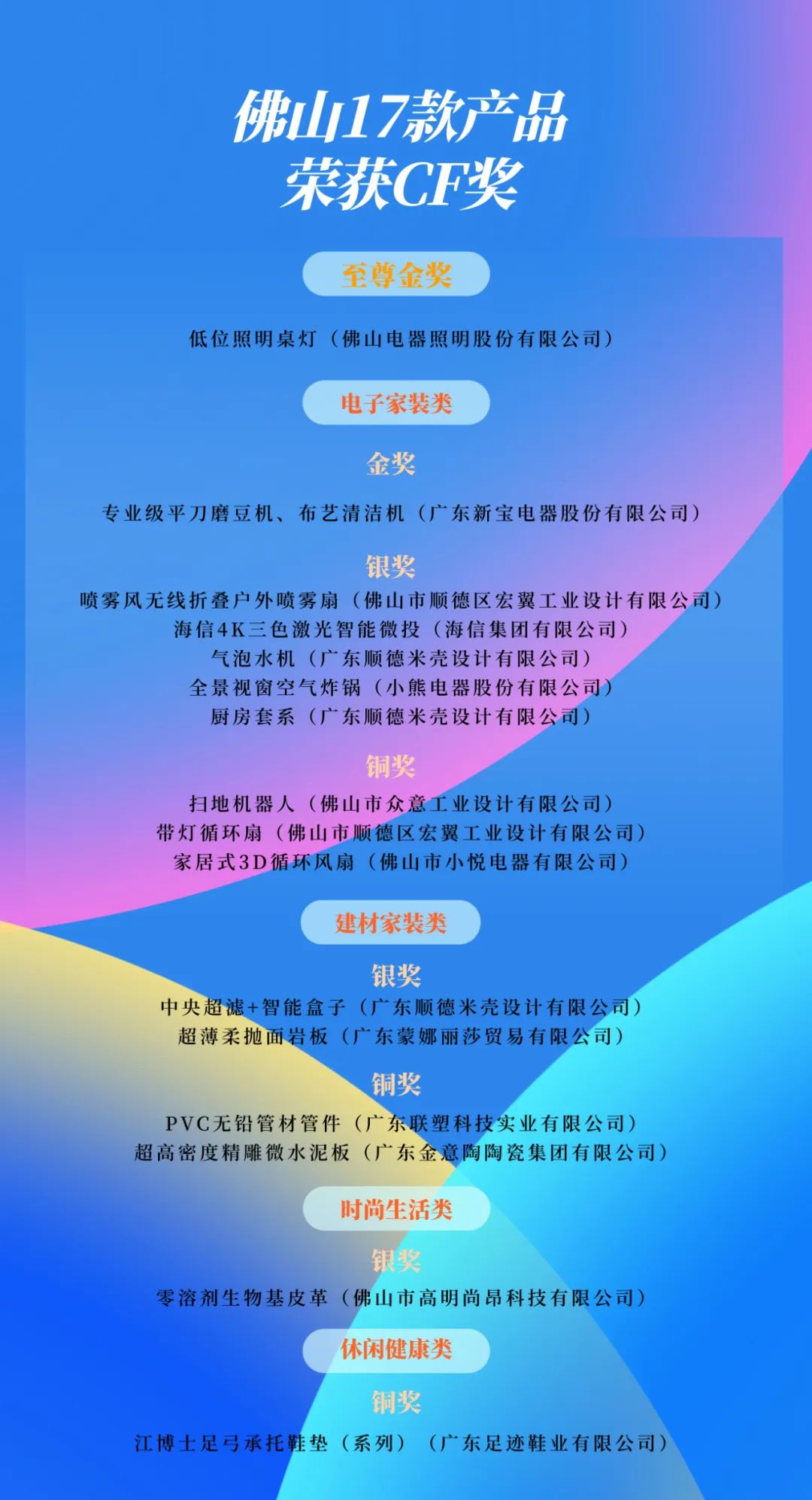 佛山完整获奖名单依托“中国第一展”广交会,CF奖创办于2013年,奖项含金量十足。与其他设计奖项相比,CF奖更强调产品设计的商业应用和创新成果的市场转化,积极推动各国企业设计全球共享。今年是CF奖创办的第十一年,奖项评审办公室邀请了来自设计界、商贸界、产业界的29位评委参与评审,包括世界设计组织现任主席大卫·库苏马等权威专家。