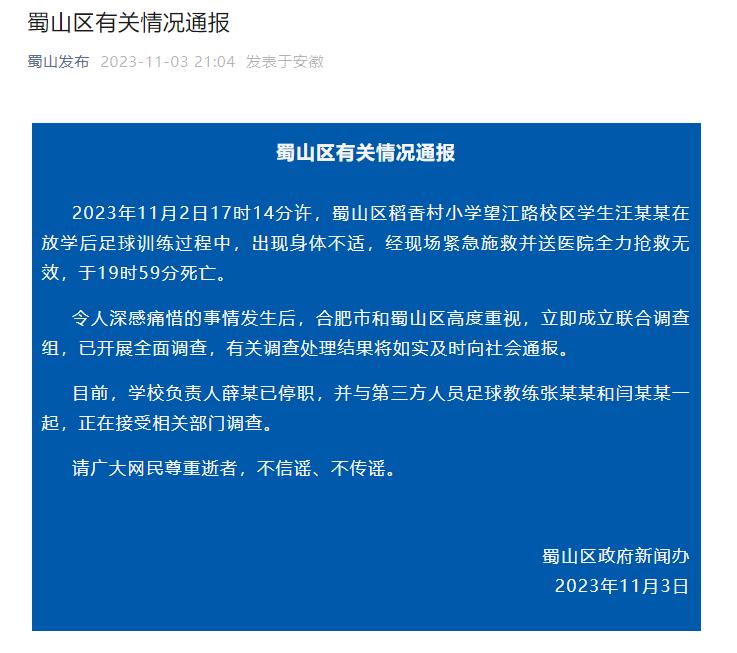 2023年11月2日17时14分许,蜀山区稻香村小学望江路校区学生汪某某在放学后足球训练过程中,出现身体不适,经现场紧急施救并送医院全力抢救无效,于19时59分死亡。