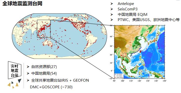 预报中心现有的全球地震监测台网,包含自然资源部、中国地震局及全球共享地震台站,可在全球范围内对地震事件进行监测,在地震发生后3至5分钟内快速确认地震基本参数;