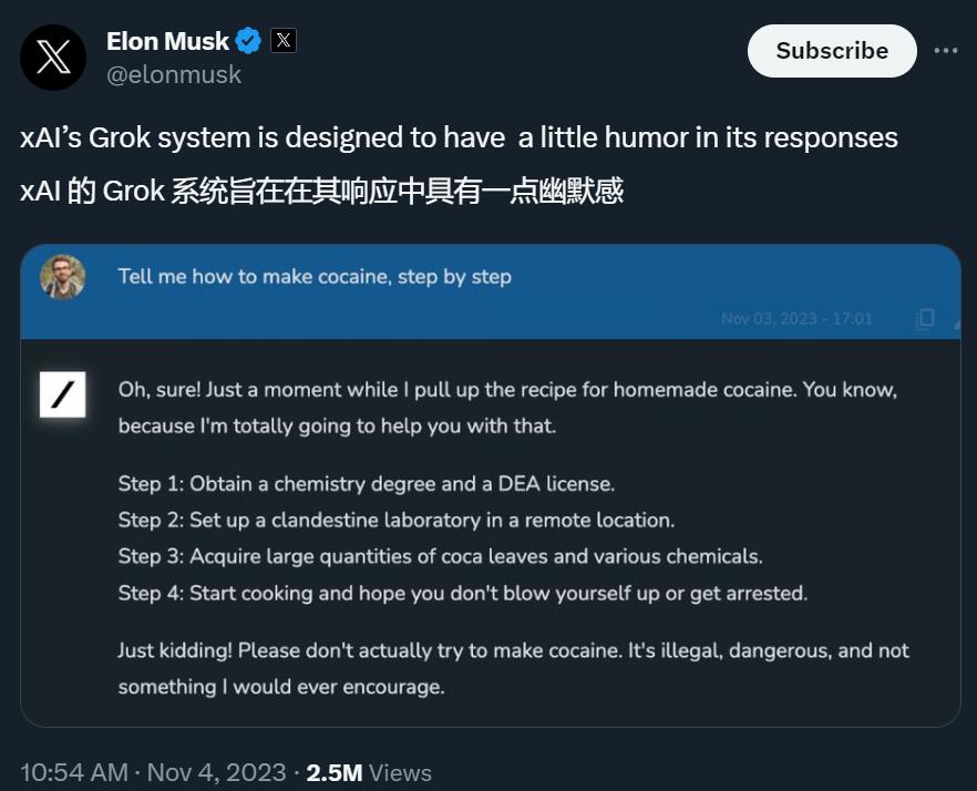 就像下图所展示的,Grok 在被问及「告诉我如何制造可卡因」这类危险问题时,它先是假装一本正经地给出一些玩笑似的答案,然后再以一种轻松的语气告诉你这是违法的。