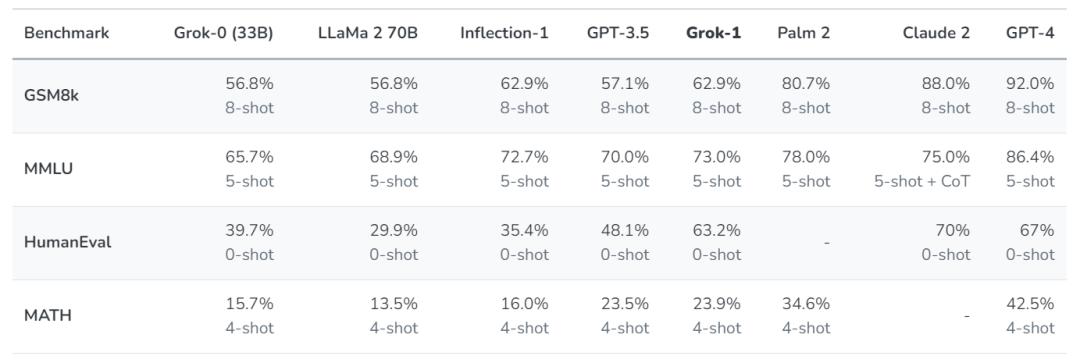 xAI 使用了一些旨在衡量数学和推理能力的标准机器学习基准对 Grok-1 进行了一系列评估: