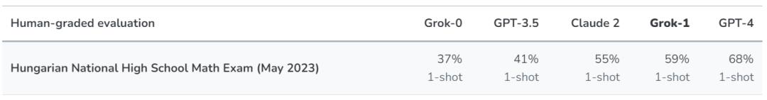 不过,xAI 也表示,由于这些基准可以在网上找到,他们不能排除模型无意中在这些数据上进行了训练。因此,他们在收集完数据集之后,根据五月底(数据截止日期之后)公布的 2023 年匈牙利全国高中数学期末考试题,对他们的模型(以及 Claude-2 和 GPT-4 模型)进行了人工评分。结果,Grok 以 C 级(59%)通过考试,Claude-2 也取得了类似的成绩(55%),而 GPT-4 则以 68% 的成绩获得了 B 级。所有模型在测试时都将温度设置为 0.1,且被给到了相同的提示。xAI 表示,他们没有为应对这个考试而特别准备或调整模型。