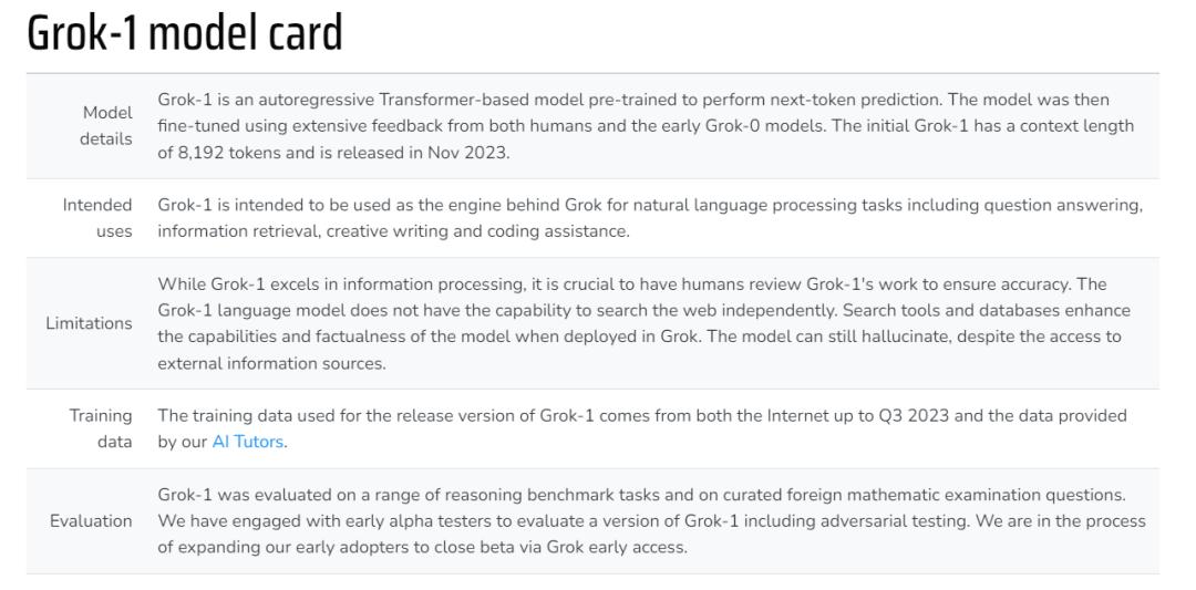 预期用途:Grok-1 将作为 Grok 背后的引擎,用于自然语言处理任务,包括问答、信息检索、创意写作和编码辅助。