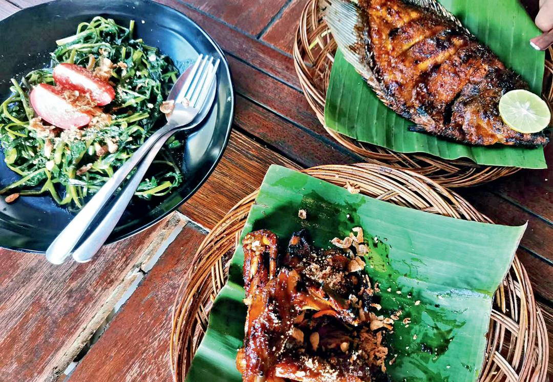 “黑乎乎”的代表就是烤鱼、沙爹。烤鱼是在婆罗摩火山脚下一座环境优美的餐厅品尝到的,盛在碧绿鲜嫩的芭蕉叶上、看起来黑乎乎的烤鱼飘着阵阵香气,涂在鱼表面的酱料酸中带甜,似乎很符合江南人的口味,以至于一路下来,四个江南女子时不时会惦记起这份黑乎乎的烤鱼。沙爹是用牛肉、羊肉、鸡肉腌制后再炭烤而成的烤串,外面裹着一层厚厚的沙爹酱,这种酱料是由椰油、椰糖、虾酱等调制而成的复合调味料。看着当地人一盆盆地吃,我们也点了一小份尝尝,搭配米饭,感受印尼风味的沙爹味道。虽然不同店家做出的沙爹酱味道各有不同,但总体是重口的,辛辣咸香,后味带甜,有点一言难尽。