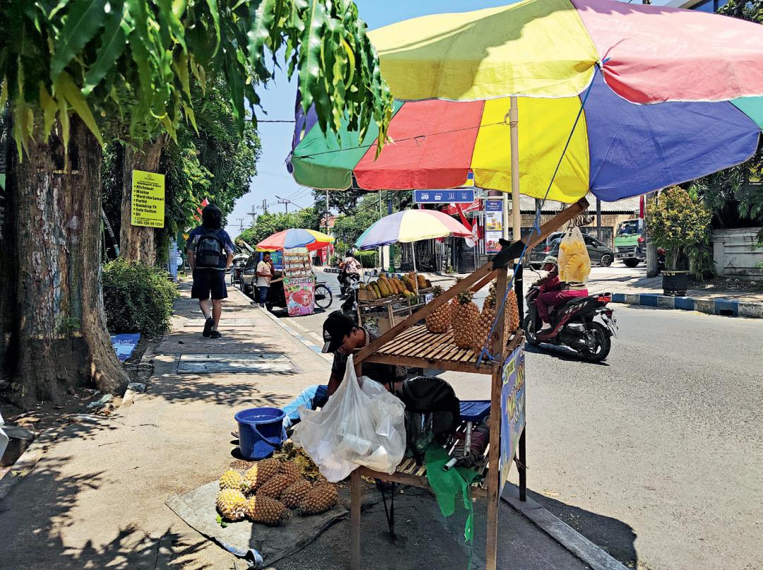 糯米配上椰丝的甜点在印尼一些小镇的街上,常见卖各种水果的流动推车,有木瓜、牛油果、凤梨等等,所有摊位都明码标价,水果的品质很好,价格也非常公道。蛇皮果是当地特色水果,红褐色的外皮像极了蛇皮,不禁让人感叹造物主的神奇。剥开薄薄的外皮,露出白色的果肉,肉质板正如椰肉,口感爽脆,不苦、不涩,很清甜,似乎带有青枣、菠萝蜜和榴莲的混合味道,当地人将其视为“记忆之果”和“美容之果”。