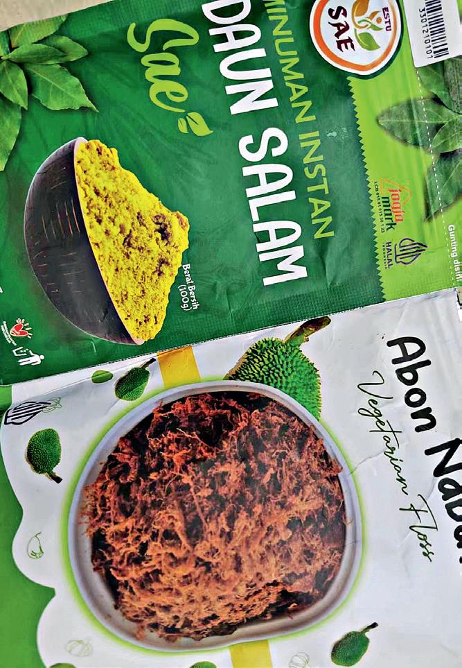 印尼小镇街头的菠萝摊印尼之行轻装去、轻装回。因为看不懂印尼语,在机场时凭着多年摸茶叶的经验和对包装上图片的直觉,只带回来两种食品。回来后认真研究,一种包装上写的“DAUN SALAM”的是一种叶子,一般称为“月桂叶”,磨成粉后可以炖菜、熬酱汁,提升食物的风味;另外一种包装上写着“KLUWEH FRUIT”,图片看起来像菠萝蜜和可可豆混合制成的蔬菜松(外形看起来像肉松),素食主义者应该会喜欢,可以过粥或拌饭,微辣中带甜味,非常不错。