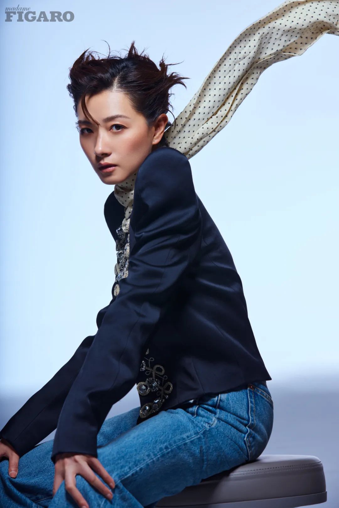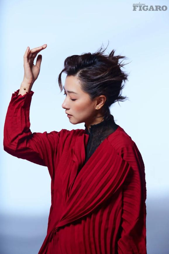 这次封面故事拍摄的造型跟以往熟悉的优雅万茜截然不同,有股武侠的气质。她认为妆造和表演对于作品的呈现是同等重要的,甚至在一个角色的塑造中,人物的服化是先于表演可见的,它是第一眼就能带给观众的,使人能判断出这个人的性格和生活境况。就像看到此次封面大片作品时,耳边仿佛响起武侠片独有的旋律,节奏张弛有度,全曲一气呵成,画面一下子“动”了起来。