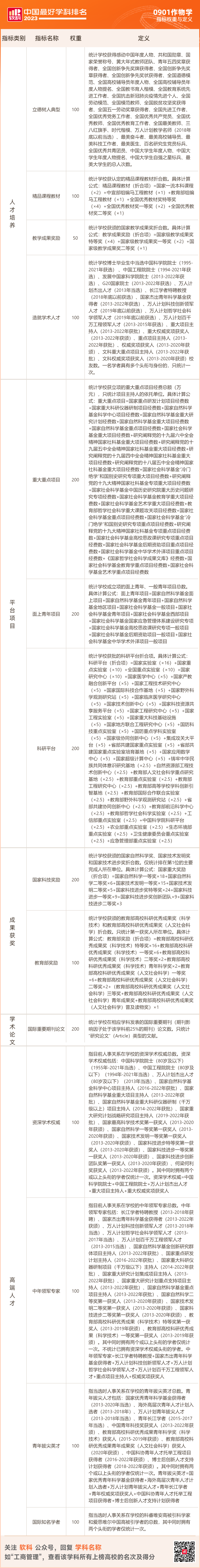 软科中国最好学科排名的指标体系包括人才培养、平台项目、成果获奖、学术论文、高端人才5个指标类别,下设18个指标,共计70余项反映学科竞争力的观测变量。排名数据全部来自第三方数据源,如教育部、科技部、国家自然科学基金委员会、国际和国内文献数据库等。(点击查看软科中国最好学科排名方法)