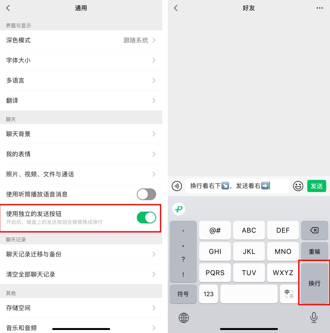 首先是新上线的独立发送按钮功能,安卓和iOS新版均支持使用。这一功能将使微信的文本输入更便捷,同时提供更多个性化选项。开启后,iPhone自带输入法原来的“发送”变成了“换行”,对话框右侧是发送键,可以实现一键回车换行。
