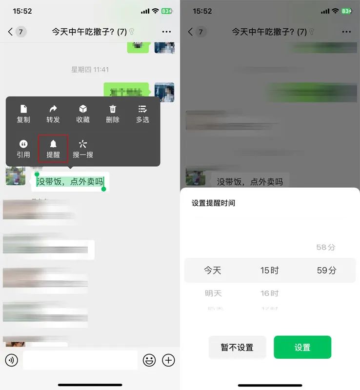 只需长按聊天框中的文本内容,并选择“提醒”,然后设置提醒的时间,“微信闹钟”就添加成功了。