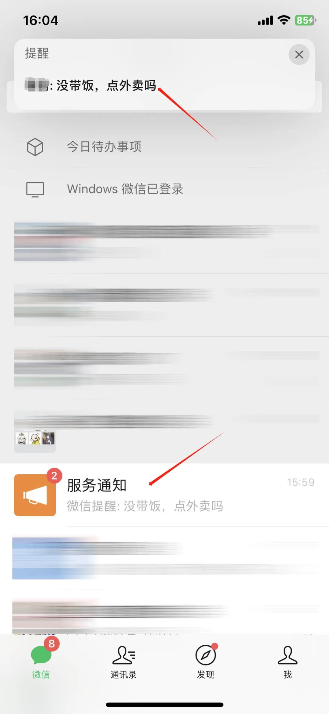 到设定的时间后,在微信主界面,屏幕上方会出现有关“提醒”的通知横幅,直到我们手动关闭才会消失。同时服务通知也会发来微信提醒。这样我们就可以避免忘记重要的代办事项啦。