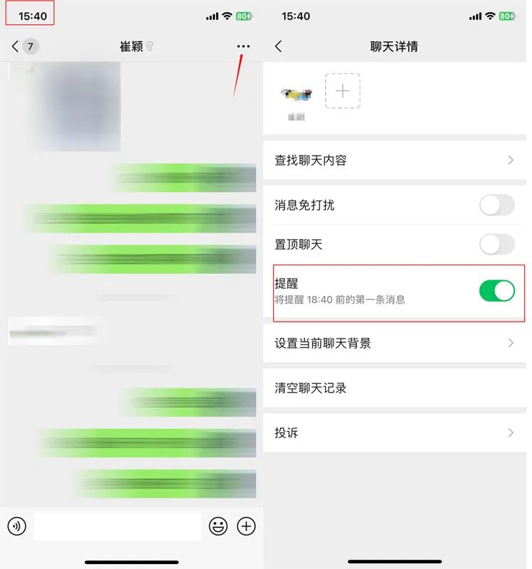 这还只是官方介绍的其中一个“闹钟”提醒功能,其实微信还有另外一种提醒功能,那就是好友强提醒了。比如,某个很要好的好友,我们不想错过TA的任何消息,可以点开这位好友的聊天界面,点击右上方“...”,往下翻到“提醒”后打开右边的按钮。