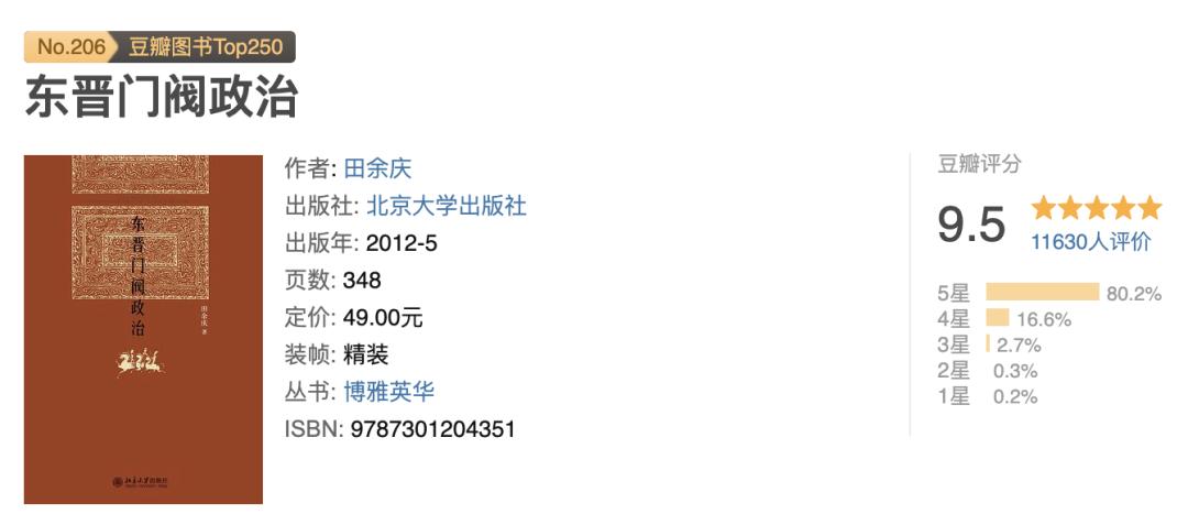 例如史学大家田余庆先生的《东晋门阀政治》,自从89年出版后畅销数十年,在豆瓣上的评分高达9.4分。读者评价它为治史典范、令人如沐春风、击节赞叹,更有人说看这本书如同看剧一般畅快。