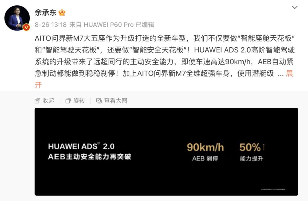 在新M7的上市发布会上,余承东特别提及新M7搭载了业内首发的全向防碰撞系统,能够实现前向、侧向和后向全向防碰撞能力;AEB最高刹停时速提升至90km/h,可减少90%因注意力不集中和路况复杂造成的交通事故。但他未明确提及数据的来源及可靠性。