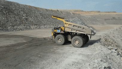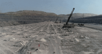 接下来是平均厚度为56米的岩石层,分为上下两层,上层采用单斗挖掘机—自卸卡车的间断开采工艺,下层采用抛掷爆破—吊斗铲倒堆开采工艺。看视频快速了解