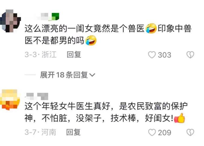 此外,还有粉丝通过她的视频学知识,有人说“第一次知道牛的脚上也有血管”,有人自我调侃“沉迷于母牛的产后护理”,也有人靠她的短视频治愈自我——他们说,上了一天班特别累,回家躺床上看白婳的视频,“搞笑又解压”,还有人感叹“一个女孩还在牛圈里被牛又踢又撞,自己又有什么资格不努力呢?”