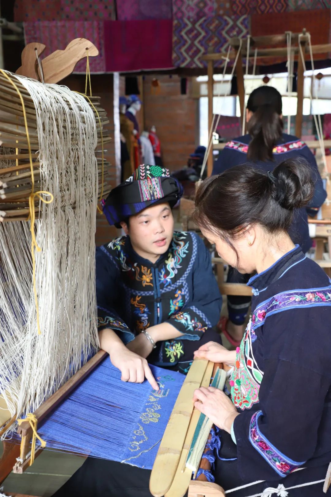 冀麒宇(左)指导织娘如何织锦。清远日报记者 洪会强 摄