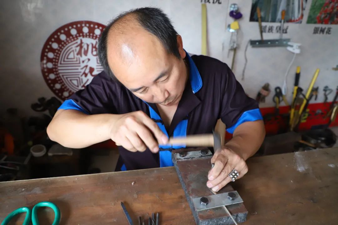 他从父亲手中接过瑶银制作手艺,干了二十多年。如果要从曾祖父辈算起,他已经是家里的第四代传人。