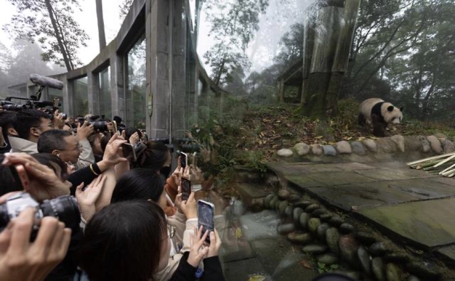 11月8日,碧峰峡景区,大熊猫“香香”日本“探亲团”在中国大熊猫保护研究中心雅安基地看望“香香”。新华社 图