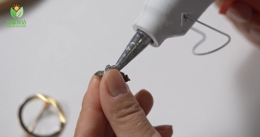 用热熔胶枪在种子上涂抹适量的热熔胶。这个步骤需要注意,胶不能涂抹太多,否则会影响胸针佩戴效果。