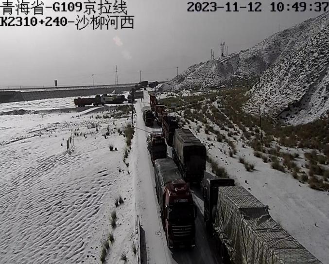 G109国道京拉线(享堂大桥-唐古拉山省界):沙柳河西路段降雪,该路段有押车现象,现路政人员、养护人员正在现场处置。