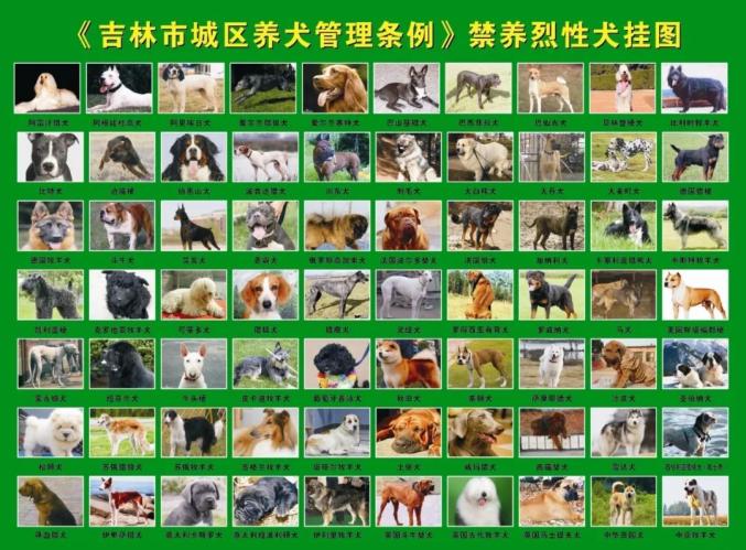 本条例所称烈性犬种包括:阿富汗猎犬, 阿根廷杜高犬,阿里埃日犬,爱尔兰猎狼犬,爱尔兰赛特犬,巴山基猎犬, 巴西非拉犬,巴仙吉犬, 贝林登梗,比利时牧羊犬,比特犬,边境梗, 伯恩山犬,波音达猎犬,川东犬,刺毛犬,大白熊犬,大丹犬, 大麦町犬, 德国猎梗,德国牧羊犬,斗牛犬,笃宾犬,恶霸犬,俄罗斯高加索犬,法国波尔多獒犬, 法国狼犬,加纳利犬,卡累利亚猎熊犬,卡斯特牧羊犬,凯丽蓝梗, 克罗地亚牧羊犬,可蒙多犬,猎狐犬, 猎鹿犬,灵缇,罗得西亚脊背犬,罗威纳犬,马犬,美国斯塔福郡梗, 蒙古细犬,纽芬兰犬, 牛头梗,皮卡迪牧羊犬,葡萄牙善泳犬,秋田犬,拳狮犬, 萨摩耶德犬, 沙皮犬,圣伯纳犬, 松狮犬,苏俄猎狼犬,苏俄牧羊犬,苏格兰牧羊犬,塔塔尔牧羊犬,土佐犬,威玛猎犬,西藏獒犬,西伯利亚雪橇犬, 雪达犬,寻血猎犬, 伊卑萨猎犬,意大利卡斯罗犬,意大利纽波利顿犬,伊利里牧羊犬,英国斗牛獒犬,英国古代牧羊犬,英国马士提夫犬,中华田园犬,中亚牧羊犬,以及经公安机关和畜牧兽医部门联合认定并向社会公布的其它犬种。