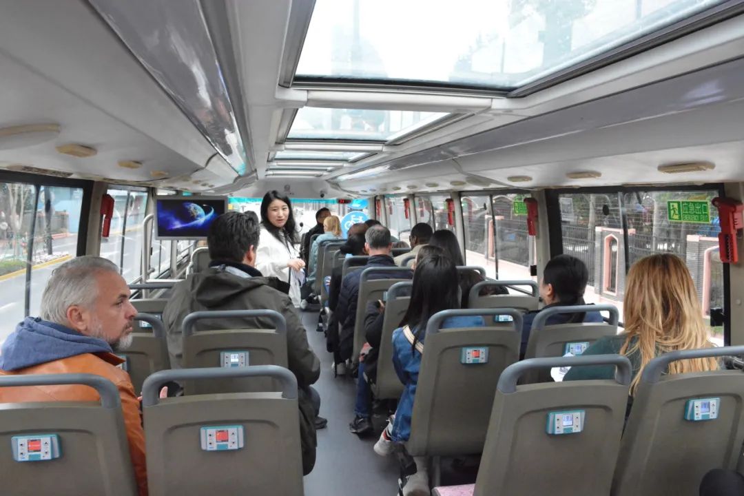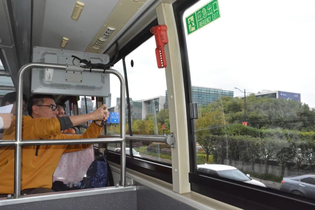 行程中,外籍友人们不时举起手机、相机,对着窗外的景色拍照留念。尤其是在经过五角场钻石连廊时,大家提出了许多问题:“它建成于什么时候?”“为什么叫钻石连廊?”“对五角场居民的生活会带来什么改变?”……对此,随行工作人员逐一悉心解答。