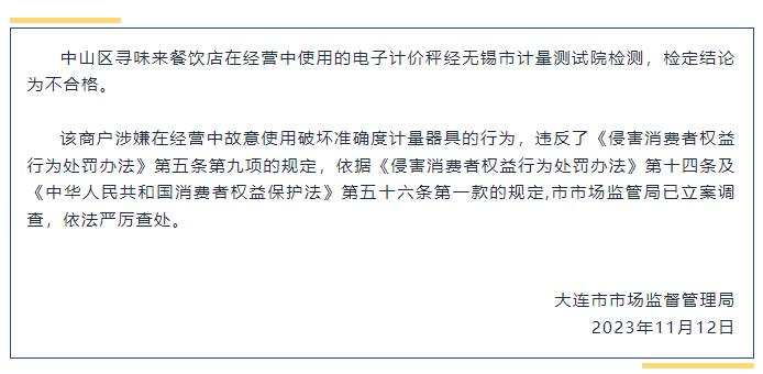 2023年11月5日,中山区市场监管局接到举报,称其在中山区寻味来餐饮店购买6只海蟹时,发现该商户存在缺斤短两行为。