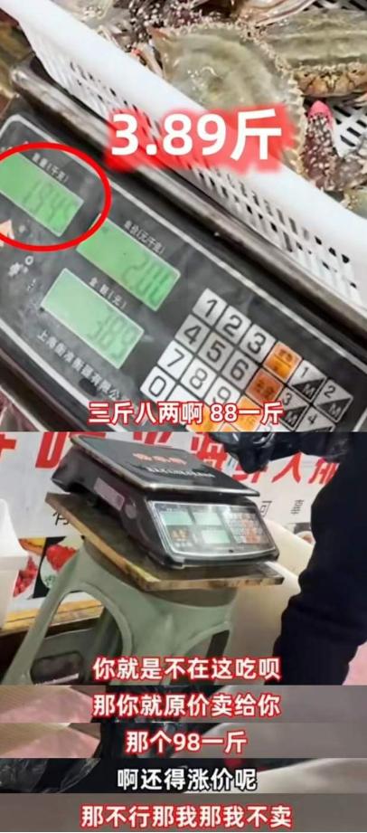 之后,“B太”又来到了一家海鲜餐厅,店内螃蟹标价88一斤,但在秤好后,因“B太”想带走,老板娘直接开口涨价,要卖他98一斤。