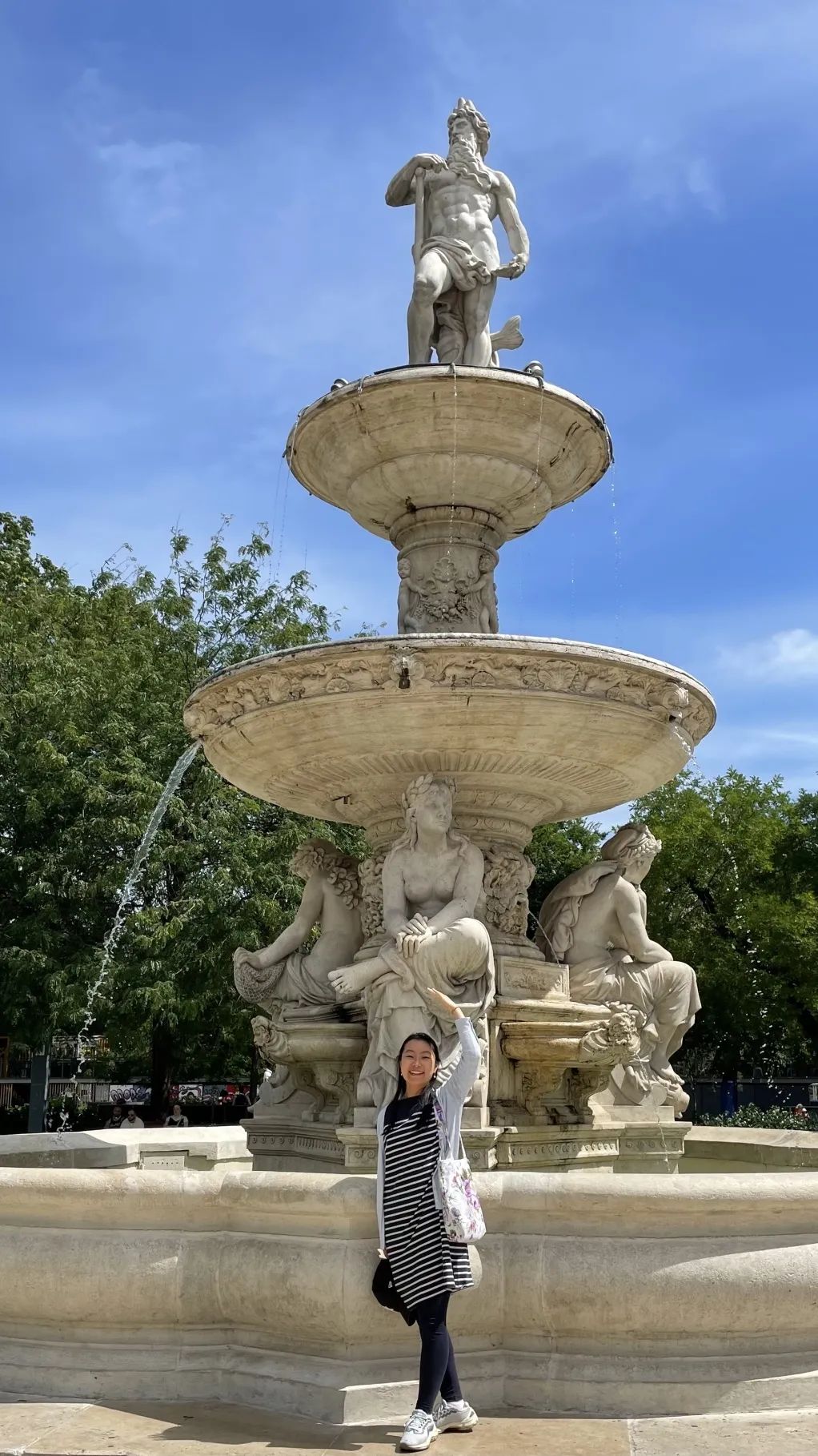 ▲吴琪贤在布达佩斯伊丽莎白广场的喷泉下摆出冥想的姿势/图源:吴琪贤一个人的事,一群人的事