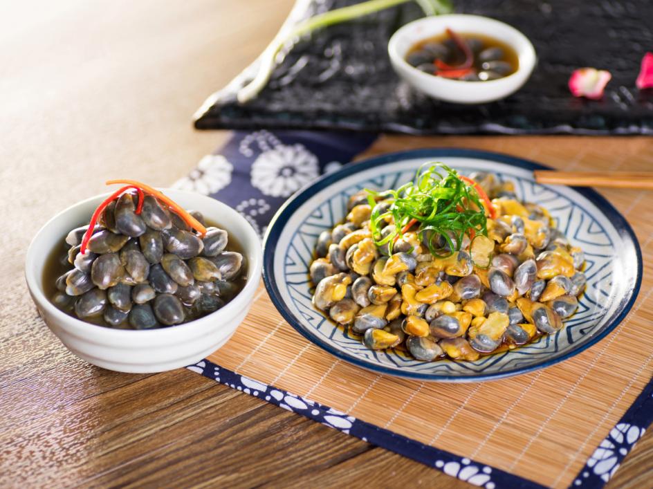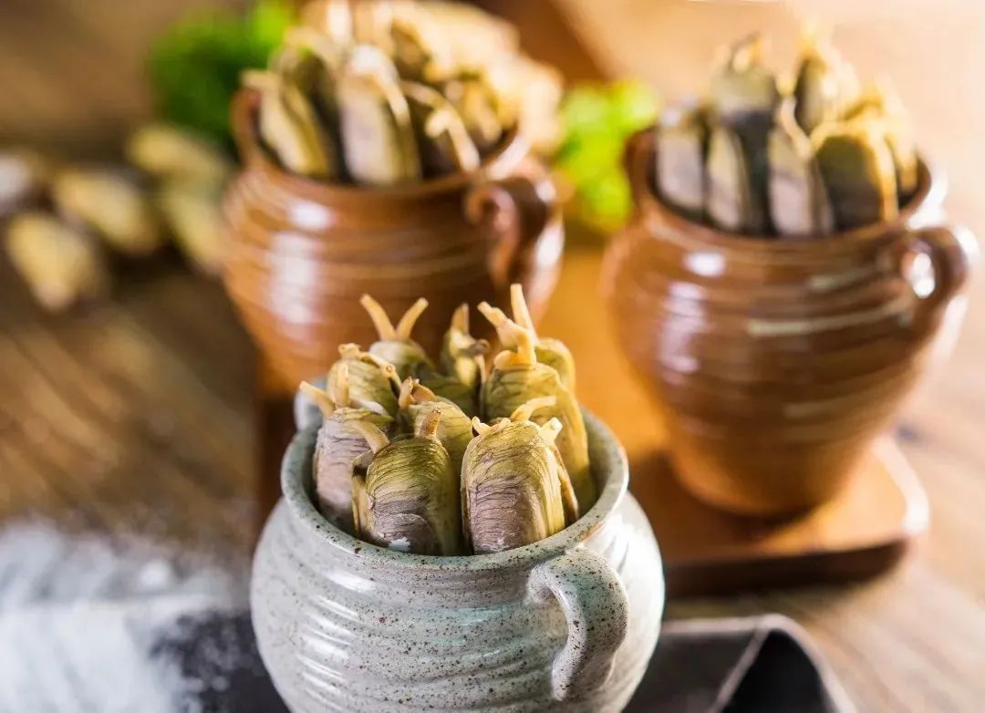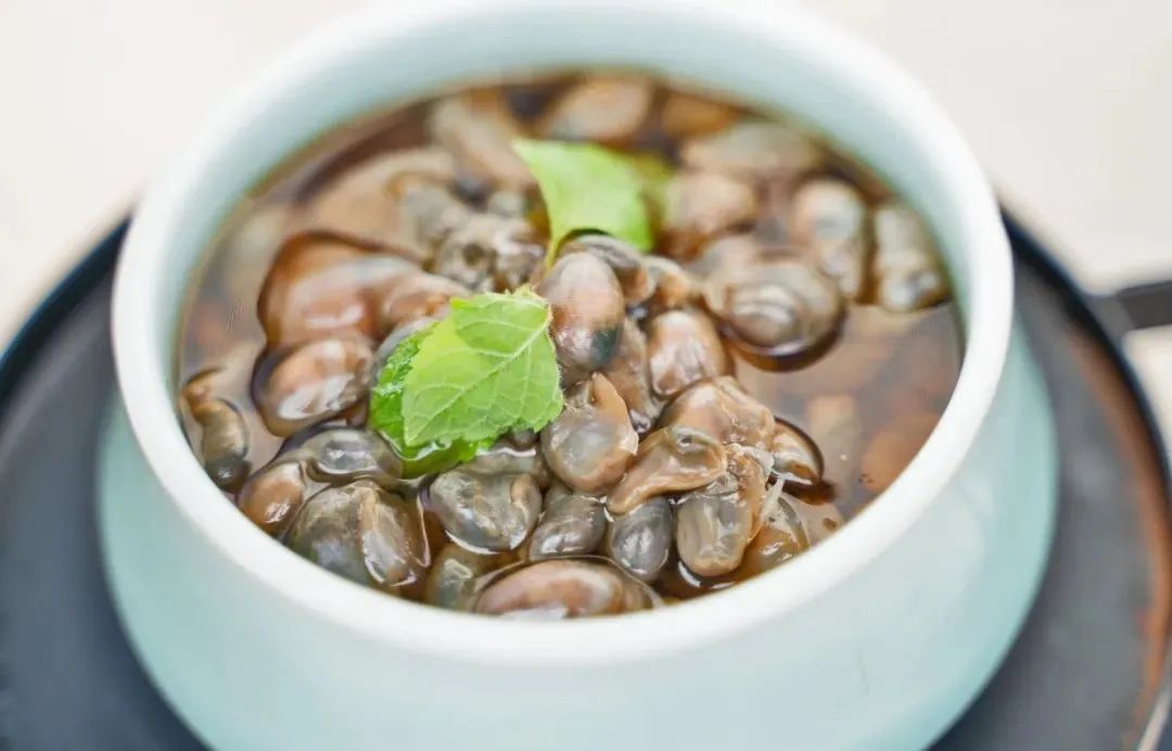 壳薄如蝉翼,螺肉通体透明,醉泥螺就像是一粒粒小琥珀镶嵌在蜗牛造型的薄壳中,尝一口,甜甜的螺肉中溢出黄酒的醇香,味极鲜。