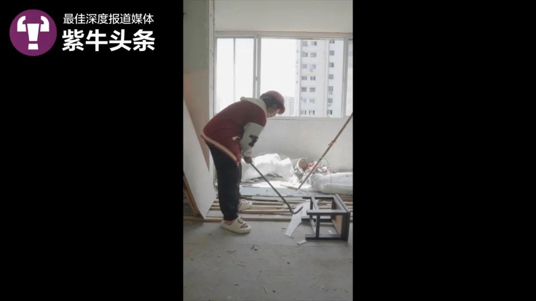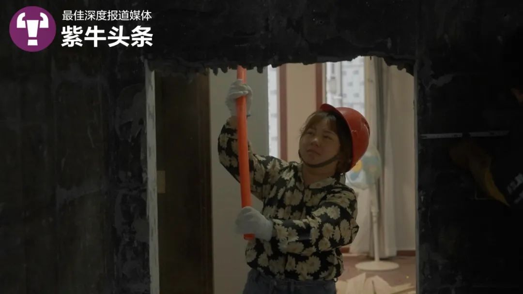 小雪今年23岁,湖北荆州人,身材娇小的她,现在能够熟练地抡着大铁锤砸墙,完成铲腻子、拆墙等重体力工作,完全看不出来一年前,她还是一名专心带娃的全职妈妈。