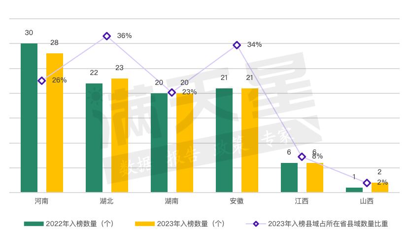 从数量看,河南入榜中部百强县数量最多,达到28个,湖北、安徽、湖南入榜数量相差不大,山西最少,仅1个。对比2022年赛迪中部百强县,河南入榜县域数量减少2个,湖北与山西各增加1个。