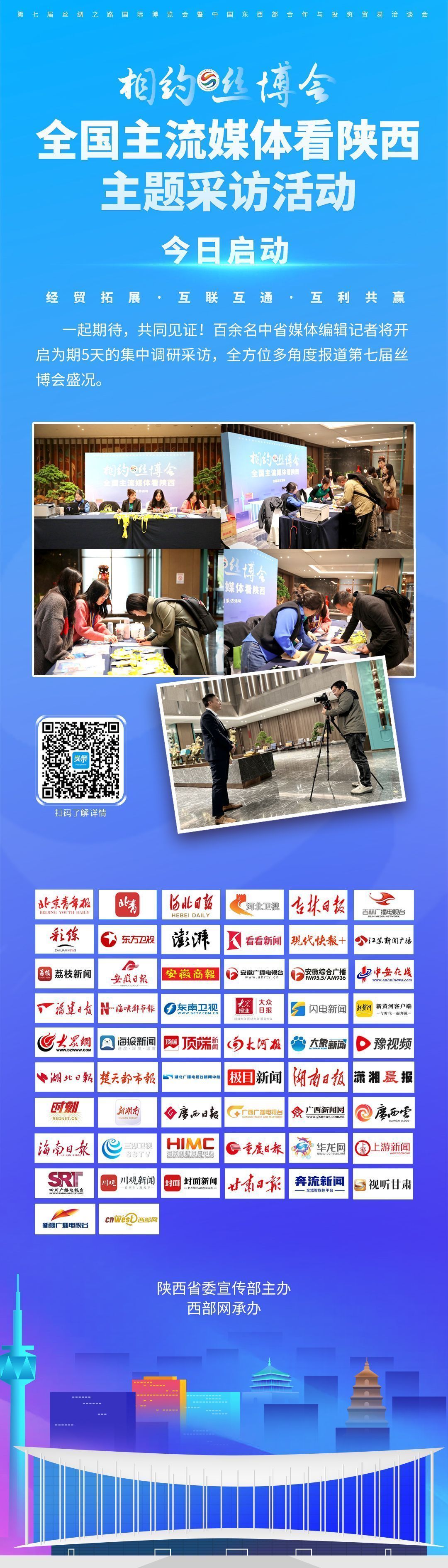 本次活动由西部网承办。在未来五天时间里,来自19个 省(区、市)60家媒体的百余名编辑、记者将深入采访第七届丝博会场馆和重点活动,走进历届丝博会落地项目,关注陕西历史文化和对外开放的新“名片”,报道陕西在“一带一路”高质量发展中取得实打实、沉甸甸的成就,讲好携手向前的发展故事。