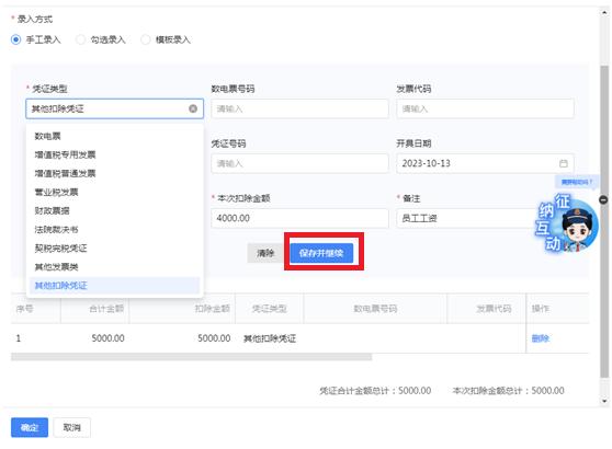 根据实际情况选择差额扣除凭证类型,并录入相关凭证信息(如劳务派遣服务中代用工单位支付给劳务派遣员工的工资、福利和为其办理社会保险及住房公积金),包括凭证合计金额和本次扣除金额,点击【保存并继续】。