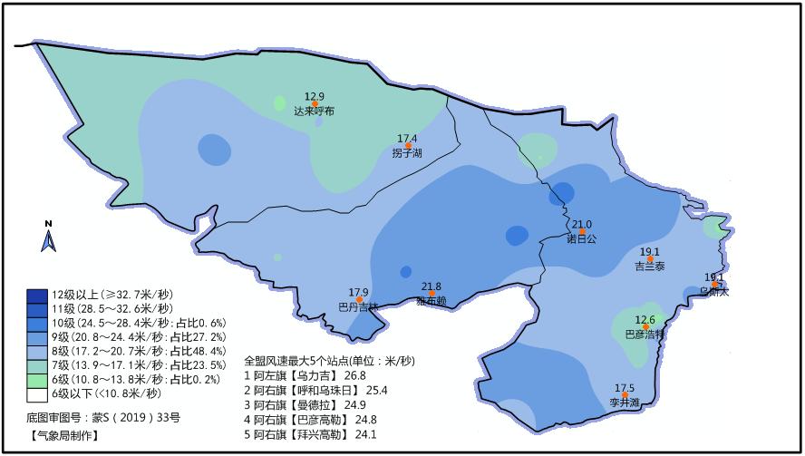 阿左旗的乌力吉为26.8m/s(阵风10级)