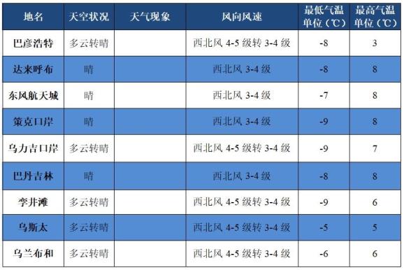 17日夜间至18日白天:全盟晴,偏西风3-4级,阿左旗北部阵风5级。