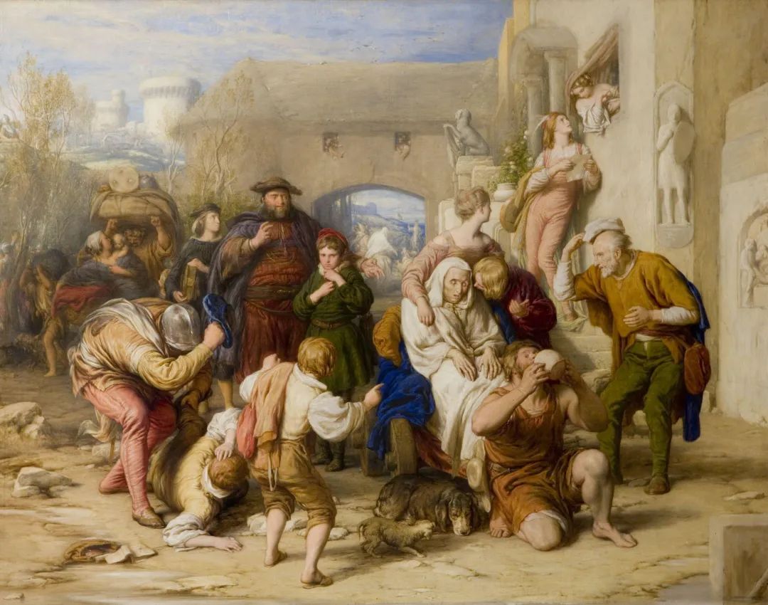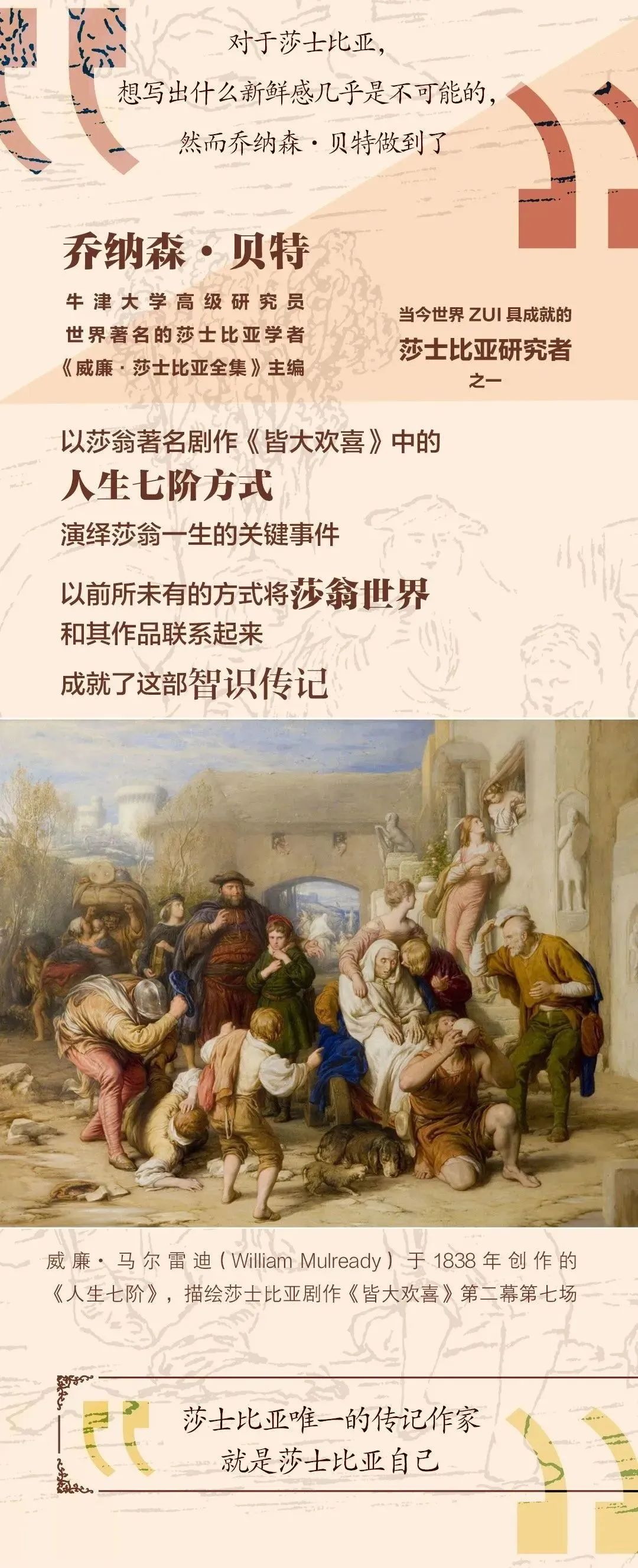 威廉·马尔雷迪1威廉·马尔雷迪(William Mulready)于1838年创作的《人生七阶》,描绘莎士比亚剧作《皆大欢喜》第二幕第七场在给这一任务划分结构时,我遵循了他的做法,将人的一生分为七个时期。我倾向于认为,如果有人委托莎士比亚为自己写传记,他也会采取类似的做法。其中每个特定的时期都吸引我们思考一个文化时刻和一个广泛的主题:婴孩时期是关于生存和环境,学童时期是关于书本知识,情人时期是关于性欲的本质,军人时期是关于战争与社会动荡,法官时期是关于正义的法律与政治,老叟时期是关于智慧与愚行,“遗忘”时期是关于面对死亡的艺术。这一方法不能提供对现实的精准映射,即能够让我们看到处于第一时期的尚在襁褓中的诗人,或者是第三时期的诗人躺在某位特定情人的床榻上——我们缺乏证据来证明这样的幻想,即使有,它们也不可能让我们深入了解莎士比亚的思想。