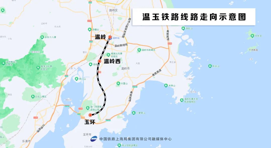 温玉铁路位于浙江省台州市南部,行经温岭、玉环两市。线路自杭台高铁温岭站引出,经温岭市温峤镇、坞根镇、城南镇和玉环市清港镇、楚门镇、龙溪镇,止于芦浦镇玉环站,设温岭、温岭西、玉环3座车站,设计时速350公里,新建正线约37.17公里,其中温岭境内约21.02公里,玉环境内约16.15公里。