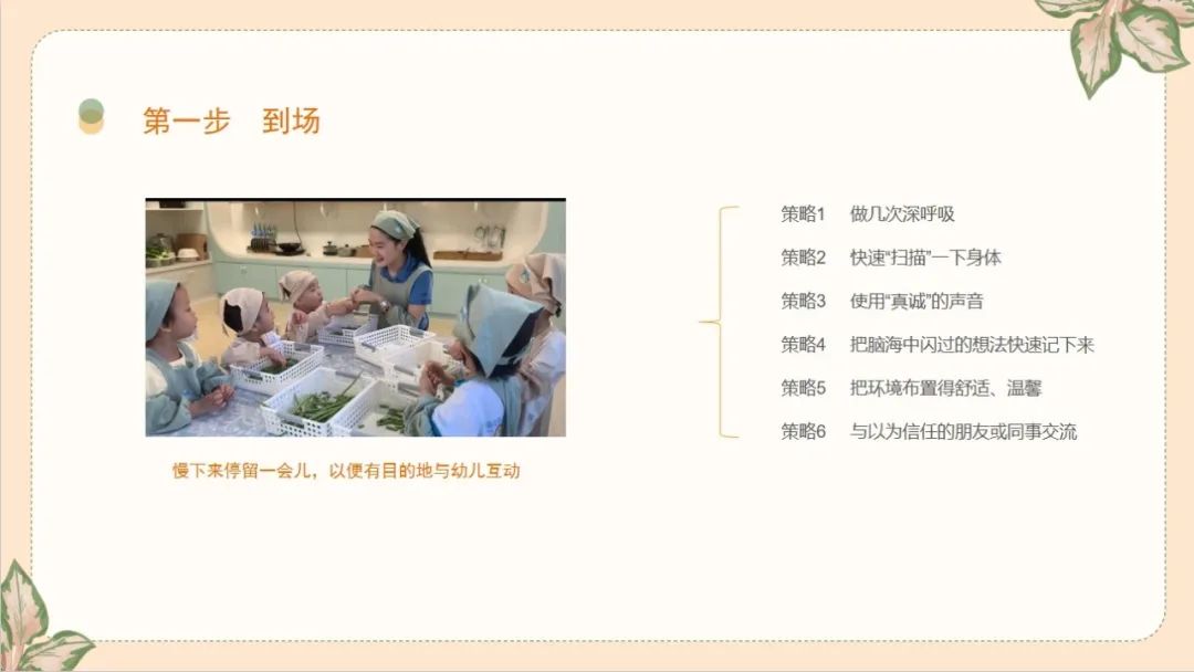 到场,让我们真正把“儿童放在心上”,专注、心境明朗地思考,做好准备进行能有效支持幼儿的师幼互动。在现实的师幼互动时,我们的言、情、行都直接影响幼儿是否真正坦诚与我们交流互动。所以,在与幼儿互动前先进行“自我检查”,做到人到、眼到、心到的“到场”。