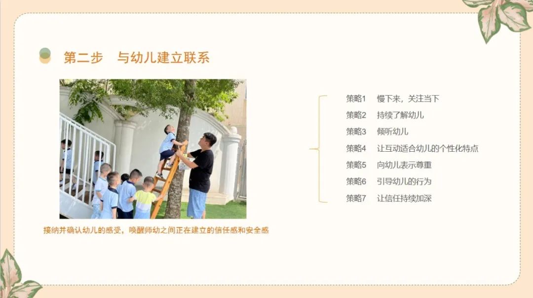 与幼儿建立联系,是指观察幼儿的所行、所言、所思中有趣的和有意义的部分,并发起有力的互动,以平和而包容的态度靠近幼儿,唤醒师幼之间已存在的信任感和安全感。信任,是与幼儿建立积极的关系和拓展他们的学习的基础。当师幼之间建立好了信任关系,可以让幼儿放心地探索、了解周围的世界,大胆地冒险。