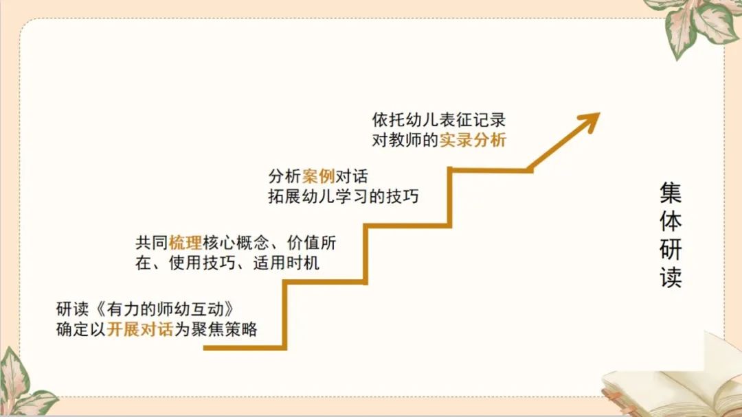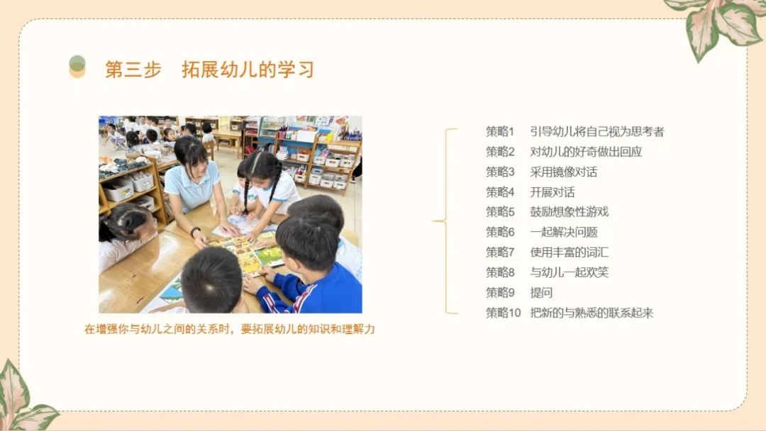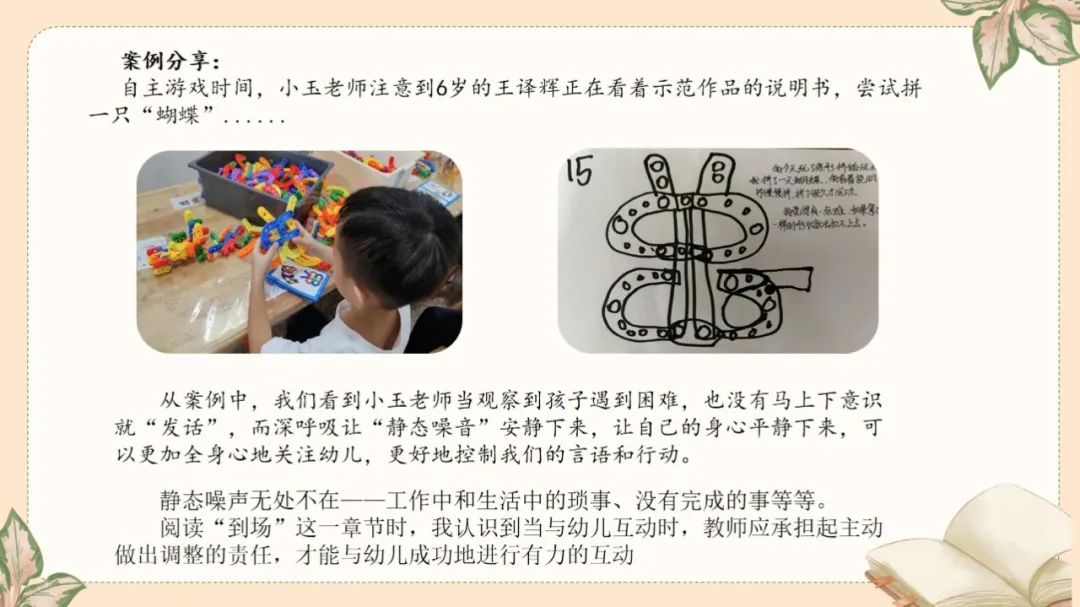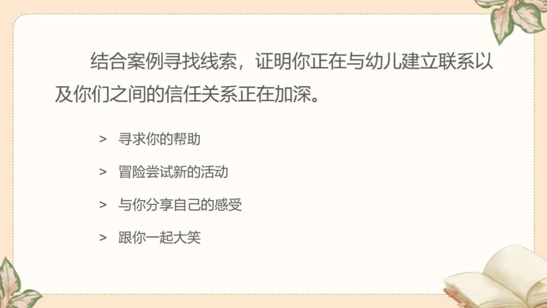 2.解读书籍内容时,理论联系实际,打开老师的学习思路,知道陪伴是建立联系的重要方式,其中信任感和安全感是基础。另外,最有效的拓展策略是“有准备”,在互动时要了解儿童的前期经验、需求和基本方法。