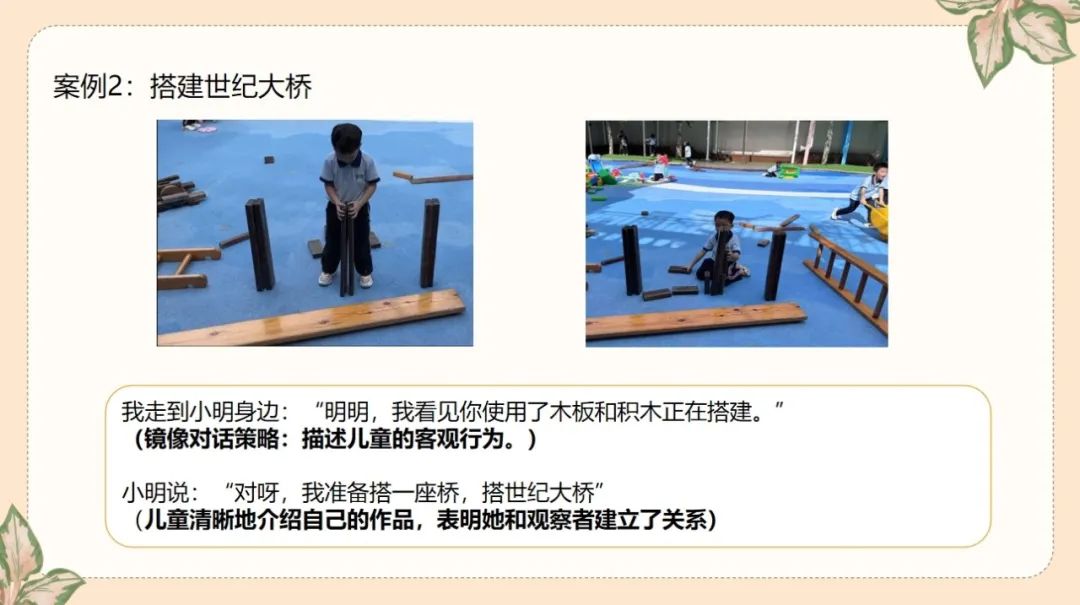 所谓镜像指的是镜子中的成像,镜子会客观真实地呈现我们的面貌、状态以及正在做的事情,相当于看到另一个自己。在师幼互动中,教师相当于这面镜子,当我们关注到孩子在工作或者游戏的时候,通过客观描述事实(孩子正在做的事情、孩子的情绪情感表现),让孩子们知道老师正在关注他,并对他做的事很重视,所以愿意和我们进一步的互动。