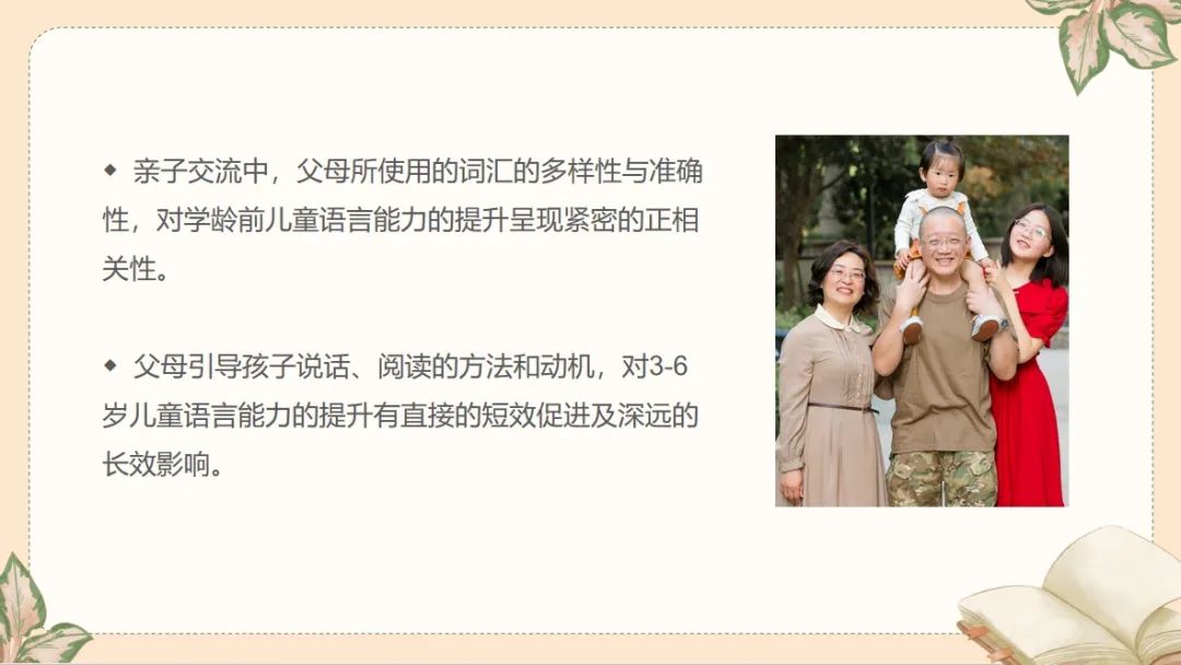 0-3岁是大脑发育的黄金期,需要幼儿所处语言环境的刺激。父母在这个时期必须与幼儿进行大量的语言交流,并且注重语言既要符合孩子的认知能力,又不能太过随意化、简单化、幼稚化。父母在亲子交流中所使用的词汇质量,即词汇的多样性与准确性,直接影响着孩子的语言应用能力。