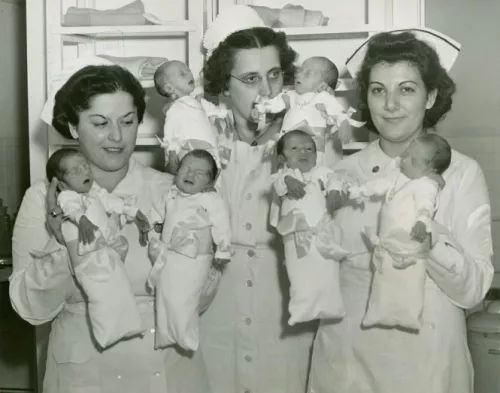 1939 年的纽约世博会,护士展示 3 对双胞胎,中间的护士是库内的女儿。图片来源:Dr. Moe Goldstein虽然人员和设备的费用高昂,库内也没找到愿意出钱的投资人,但他坚决不收家长们一分钱。于是,全部花销都只能来自展出收入。