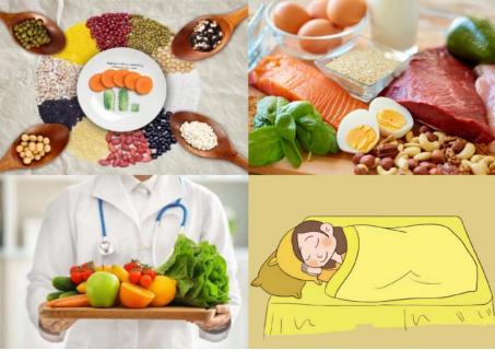 多食动物血、畜禽肉类、大枣、核桃、枸杞、桂圆、红豆、黑芝麻、花生小米、菠菜、油菜等食物,以保证铁、维生素B12、叶酸、蛋白质等的来源。